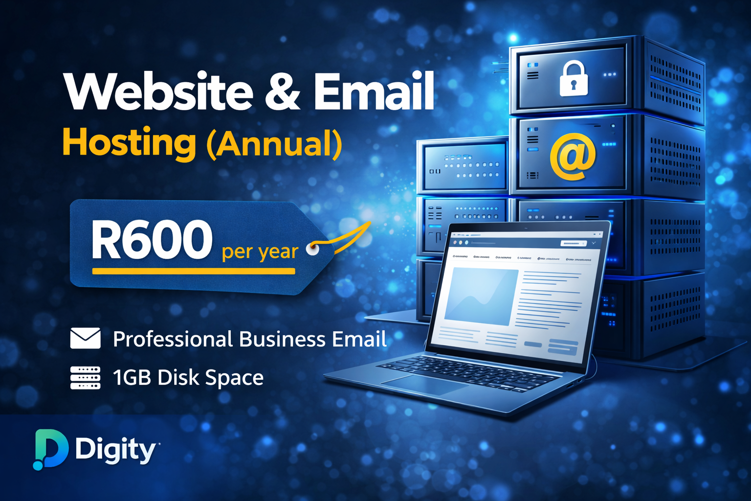 Digity’s Website & Email Hosting (Annual) package provides dependable hosting for your website along with professional business email setup, all billed once per year for simplicity and affordability.